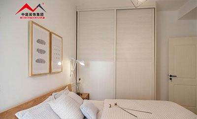 現場訂制的衣柜與房間的大小剛剛合適,推拉式的柜門節省了不少空間。
